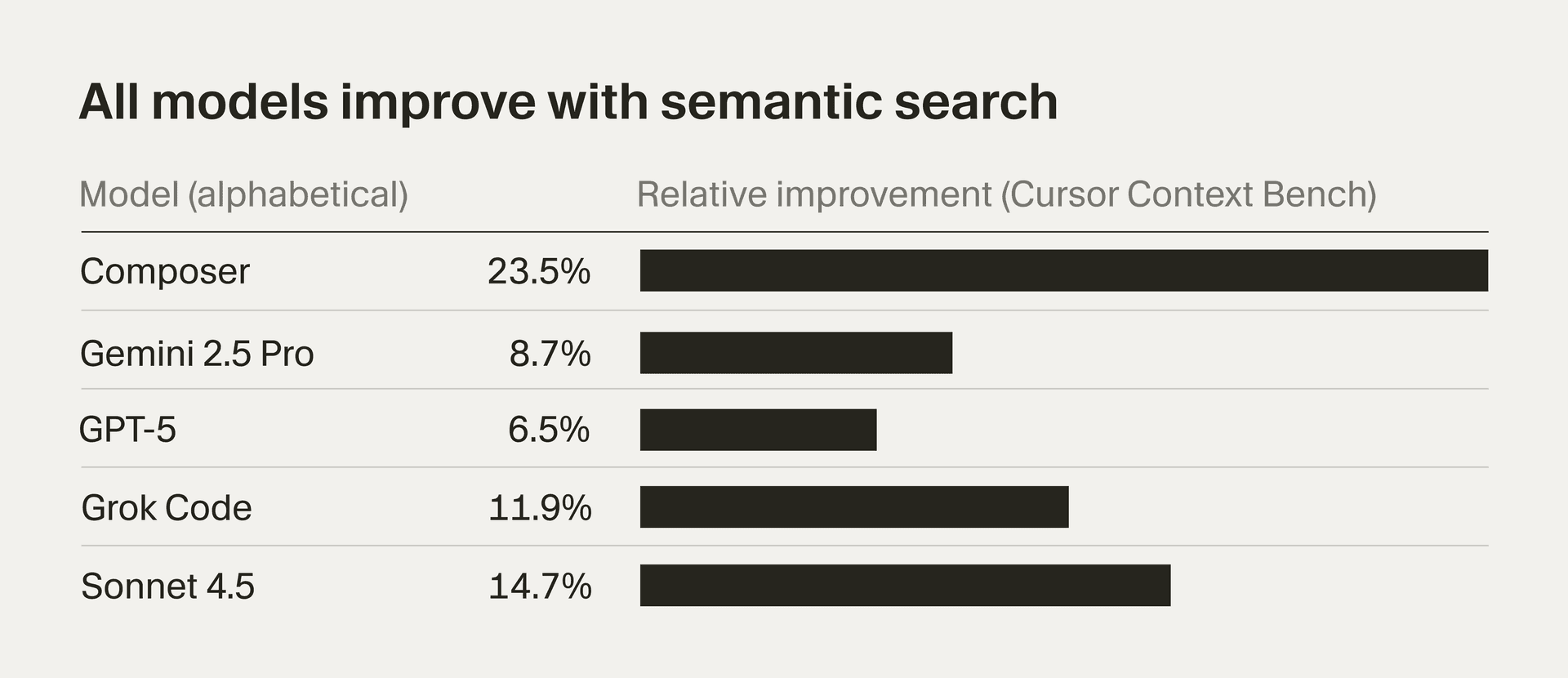 We maintain an evaluation dataset, Cursor Context Bench, focused on retrieving information in codebases with known correct answers. This evaluation is run over all of the most-used models in Cursor, including our own Composer.